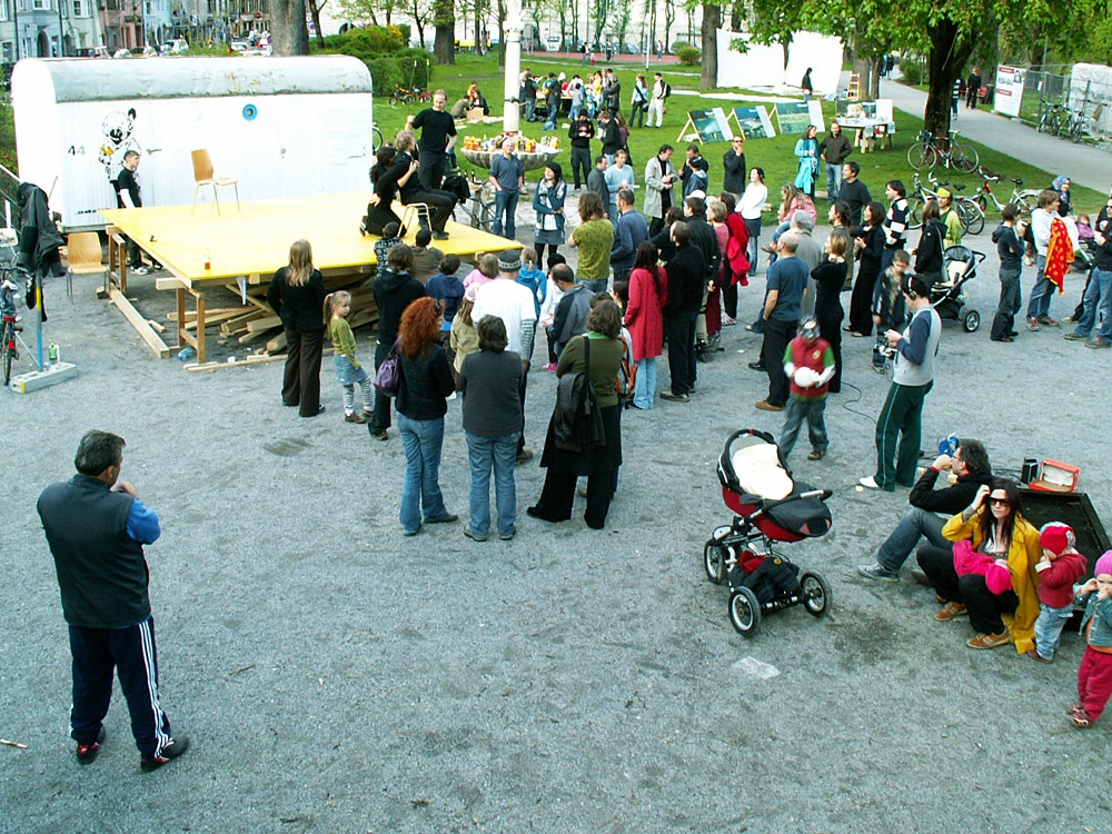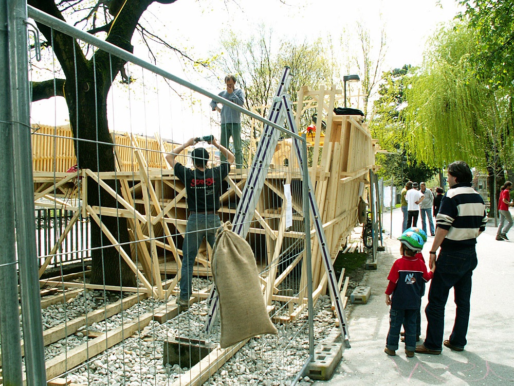 Um neben Führungen und sonstigen Veranstaltungen Architektur auch 1:1 erlebbar zu machen, beauftragte das aut erstmals 2008 im Rahmen der Architekturtage die Errichtung eines temporären Bauwerks im öffentlichen Raum. Ab April konnte im Walther-Park mitverfolgt werden, wie aus einfachen Holzlatten eine Architekturskulptur entstand. Die von columbosnext geplante und gebaute Plattform „... ich will an den Inn“ stand dann zwei Jahre lang der Bevölkerung als frei zugängliche Infrastruktur zur Verfügung.