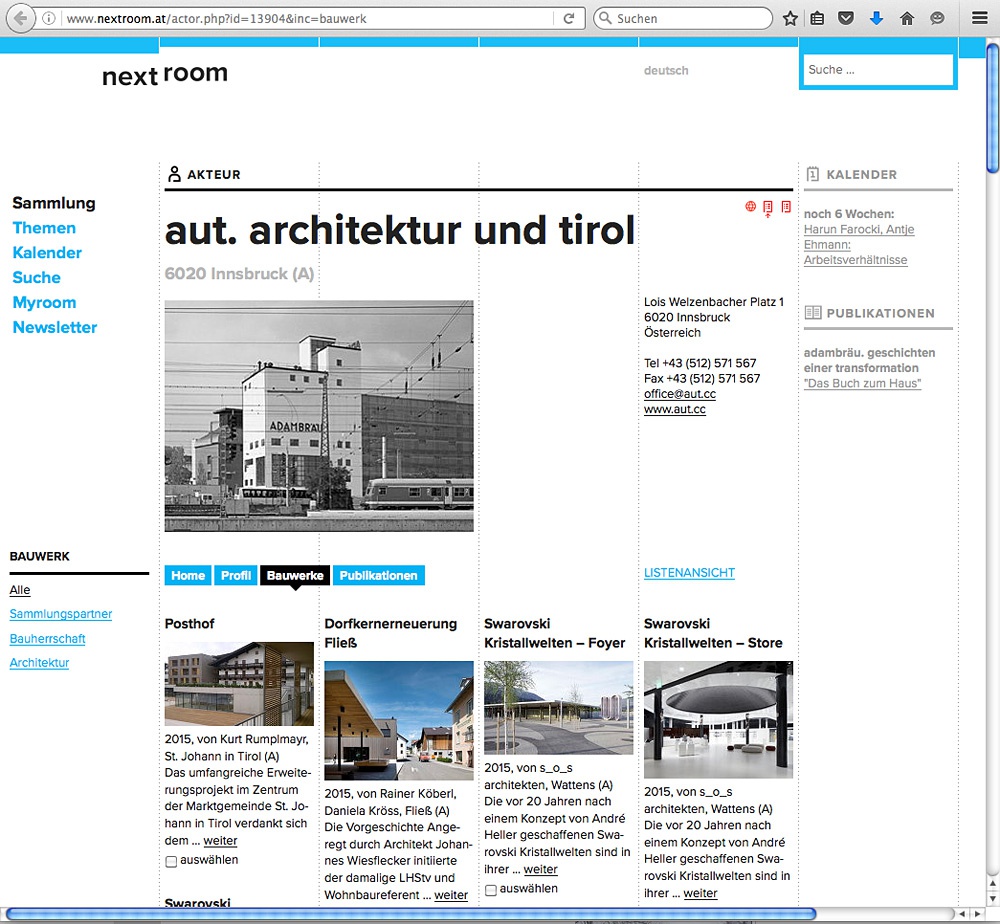 As an important component of the educational work, the “Tyrolean Building Database” has been operated as part of the internet platform nextroom since 2003. On the basis of the guide Bauen in Tirol seit 1980, compiled by Otto Kapfinger and meanwhile out of print, this collection of selected Tyrolean architecture is continuously being expanded by aut. architektur und tirol with new objects. Featuring over 1000 structures in the meantime, it offers a representative cross section through the current architecture scene in Tyrol.