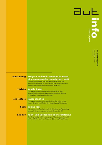 Die Ausgabe 1/09 der Programmzeitschrift aut: info mit Hintergrundinformationen zur Ausstellung „Vilanova Artigas • Lina Bo Bardi • Paulo Mendes da Rocha“ sowie zum Programm des aut zwischen Jänner und April 2009.