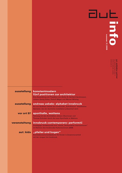 Die Ausgabe 3/09 der Programmzeitschrift aut: info mit Hintergrundinformationen zu den Ausstellungen „konstantmodern“ und „Alphabet Innsbruck“ sowie zum Programm des aut zwischen Juni und September 2009.