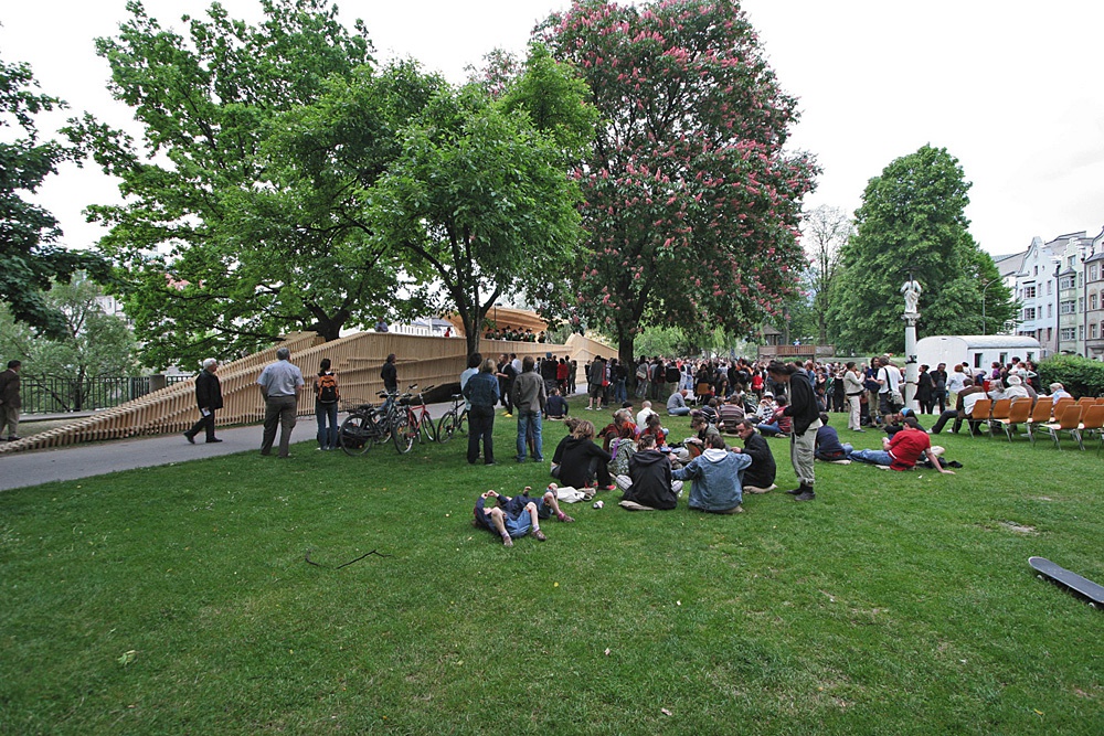 As the client of the temporary platform „... ich will an den Inn“ during the Architekturtage 2008 (architecture: columbosnext) and of the „stattSTUBE“ (architecture: Tortenwerkstatt) four years later – both in Innsbruck’s Waltherpark – aut erected structures in public space that made architecture come alive on a one-to-one scale.