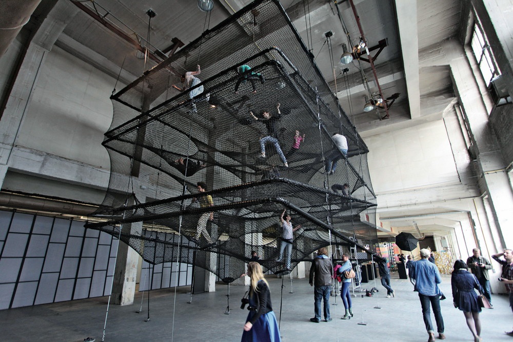 net berlin Dieses Projekt resultierte aus unserem Interesse für artifizielle temporäre architektonische Gebilde im öffentlichen Raum. Dabei werden mehrere elastische Netze in einem Höhenabstand zueinander aufgespannt. Die einzelnen Netzebenen sind mit Scheiben so miteinander verbunden, dass biomorphe Landschaften entstehen, durch die die BesucherInnen klettern können. Die Arbeit kann als eine über- sowie dreidimensionale Hängematte, aber auch als eine Art soziale Skulptur gesehen werden, die mit den Themen Schweben, Instabilität und Transparenz spielt.