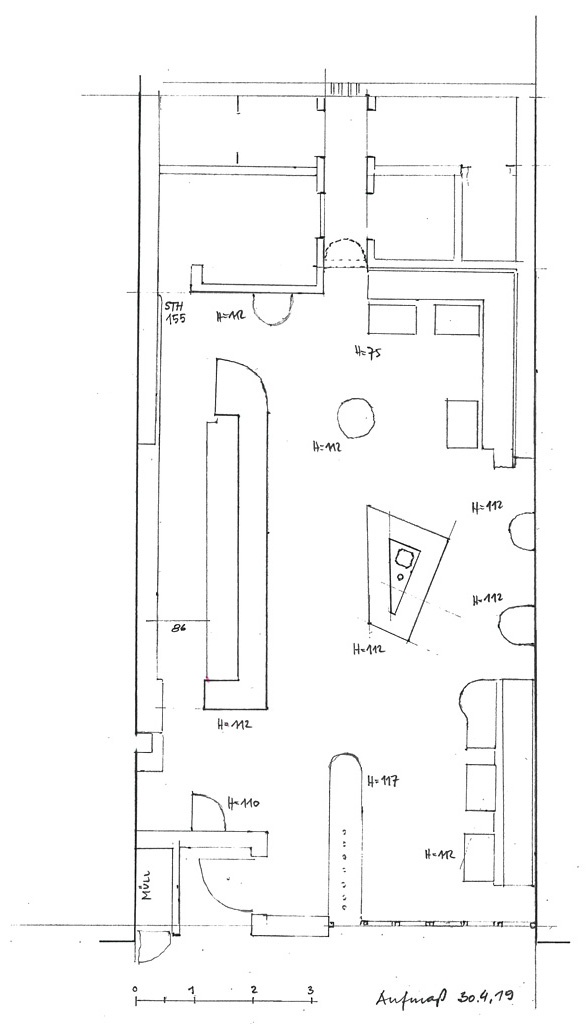 Im hintersten Eck, die Rückwand kaum verletzend, gibt es eine 50 cm breite und 155 cm hohe Tür, hinter der in einer kleinen Küche der beste Toast Innsbrucks zubereitet wird, der manchmal im Trubel auch verbrennt. Es war dem groß gewachsenen Nico wichtig, dass diese Nebentür, über der der Elektroverteiler strategisch positioniert wurde, den Barraum nicht „belästigt“. Dass sich dahinter ein hoher, fast kapellenartiger Raum verbirgt, der zwar nur Nebenraum ist, wahrscheinlich im abendlichen Stress aber Erholung für die Barkeeper bedeutet, entdeckte ich erst beim Aufmessen der Räumlichkeiten. Es macht mir dieses Lokal nun noch wertvoller, in dem so manches ausgeheckt und begonnen wurde.