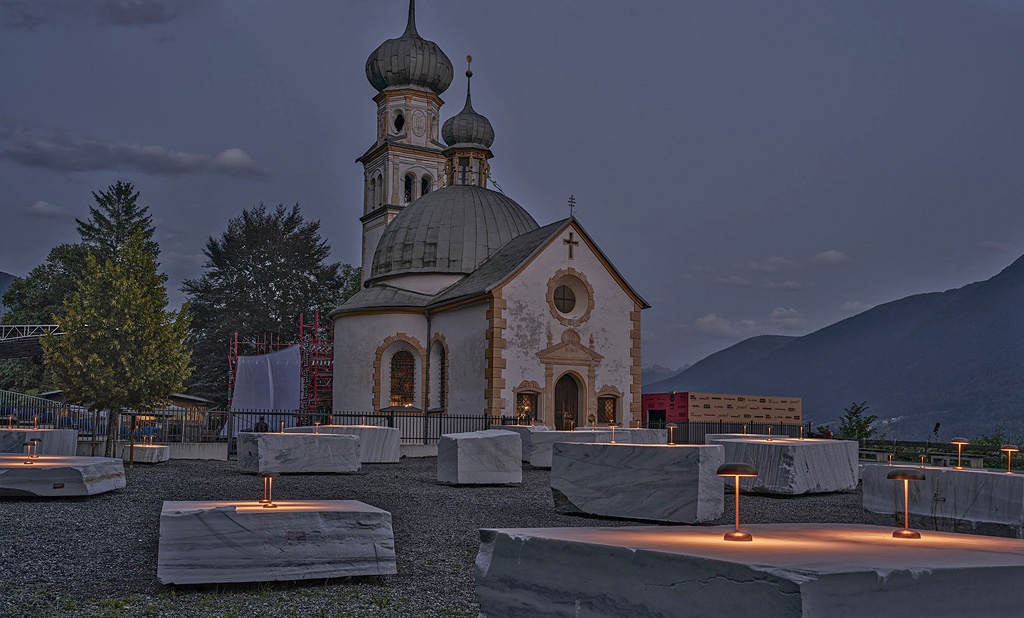 „MENSCHEN ZUSAMMENBRINGEN – DER TISCH ALS ERSTE VERKNÜPFUNG – EINE GESTE DES ANFANGS – EINTRITT IN EINE SPEZIELLE, FÜR GESCHICHTEN ERSCHAFFENE WELT – VORFREUDE, PROSECCO, WEIN, APEROL SPRITZ – SEHEN UND GESEHEN WERDEN … EDLE MATERIALIEN – ABENDGEWÄNDER – LANGE, KURZE ODER SMALLTALKGESPRÄCHE IN GEDÄMPFTEM LICHT … RAUHE UND GLATTE FLÄCHEN – IRREGULÄRE ANORDNUNG DER STEINE … DAS UNVORHERSEHBARE, JEDER STEIN KANN BÜHNE WERDEN, EINER IST JEDOCH DER GRÖSSTE … HOCHMUT, TRÄGHEIT, HABGIER, ZORN, WOLLUST, NEID, VÖLLEREI ... „SÜNDHAFT“ TEURER MARMOR VERKÖRPERT ALLES ... 7 SITZSTEINE UND 13 STEHTISCHE – EIN CHANGIERENDES BILD ZWISCHEN FRIEDHOF UND STEHBAR … GEFUNDENE TISCHE UND BÄNKE IN HOHER QUALITÄT OHNE ANSPRUCH AUF PERFEKTION … NICHTS SPEZIELL FÜR DIE AUFGABE PRODUZIERTES – KEINE MATERIALVERSCHWENDUNG FÜR DIE DAUER VON ZWEI MONATEN … STUNDENLANGES BETRACHTEN ODER FÜHLEN MÖGLICH … DER WEISSE MARMOR IST AN HEISSEN TAGEN KÜHL, AM ABEND HANDWARM“4