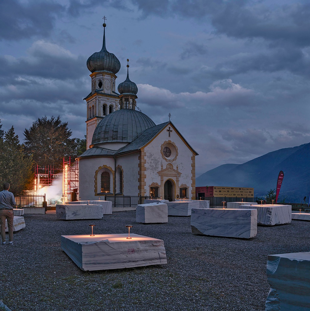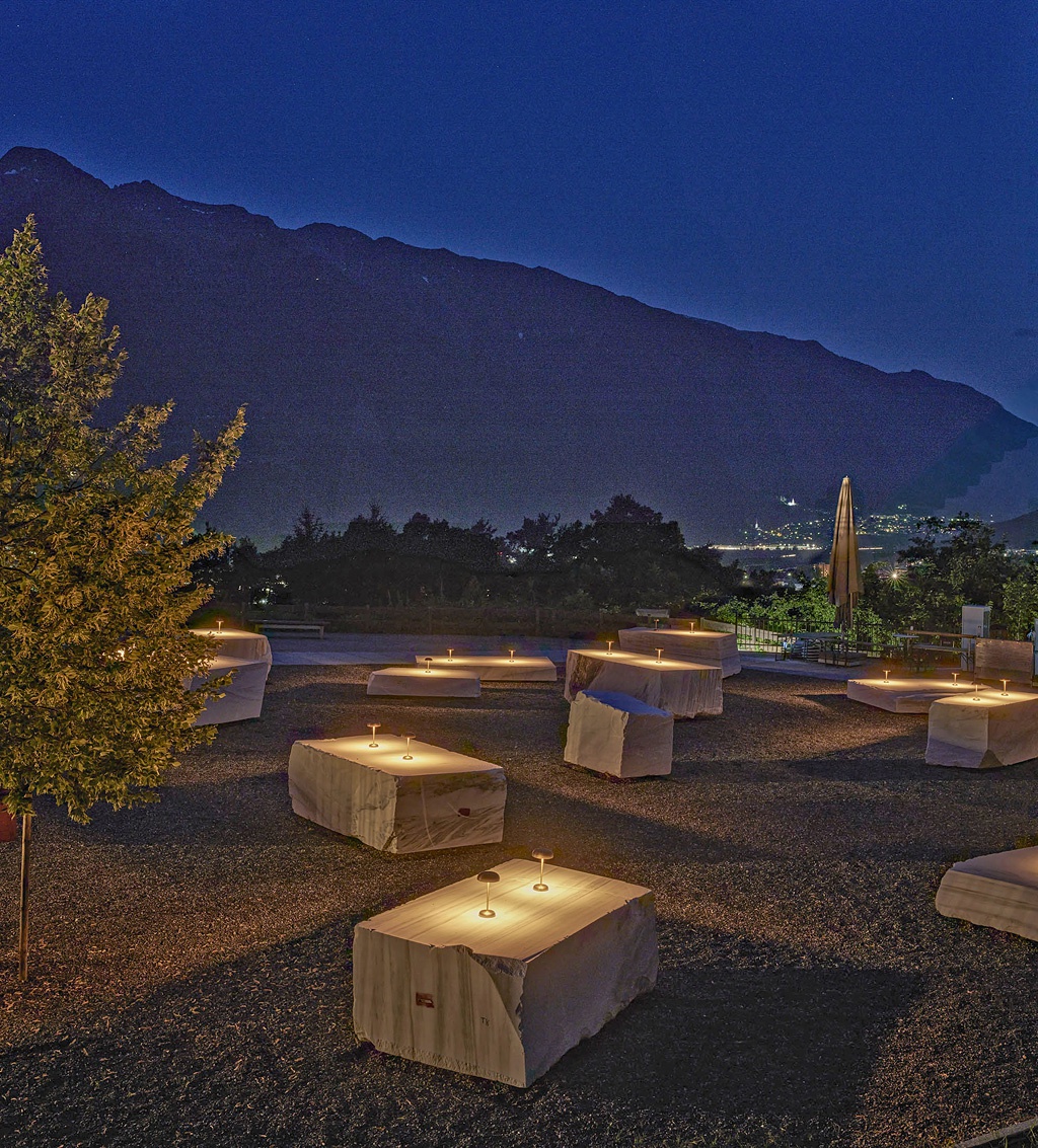 So entstand die Idee zu den Marmorblöcken aus Laas, wenngleich nicht ganz so direkt, wie es erscheinen mag. Man dachte nie an weiße „Hussen-Stehtische“, aber durchaus auch an Gebautes. Ein erlebtes Missgeschick war dann Auslöser dafür, nach Laas zu pilgern. Denn auf einer Baustelle färbte das Schalungsöl die marmormehlgefärbten weißen Fertigteile gelblich und Laas war in Erinnerung geblieben. Dort suchte man dann nach Begegnung mit der so großzügigen Frau Patscheider die verschiedenen Blöcke aus, wobei deren unterschiedliche Charaktere auch Einfluss auf die Anordnung am Birkenberg hatten.