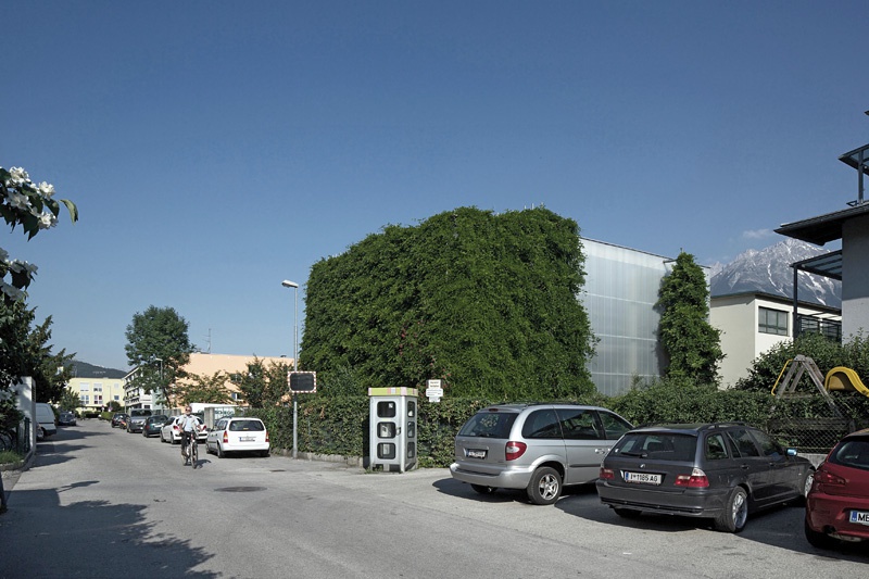 Die technische Großhandelsfirma Gradischegg musste ihre Lagerkapazität, am Ende ihres Grundstücks, welches in eine Wohngegend hineinragt, geringfügig erweitern. In einem Untergeschoß und zwei Obergeschoßen ab Rampenhöhe sollten Paletten- und Regallagerflächen entstehen. In eine Stahlbetonwanne bis auf Geländeoberkante wird die statische Struktur aus Beton, an welcher auch die Gebäudehülle aus 40 mm starken Polycarbonatplatten befestigt ist, so in unterschiedlichem Abstand hineingestellt, dass im Abstandsbereich Belichtung und Erschließung des Untergeschoßes erfolgen. Die außerhalb des eigentlichen Gebäudes liegende Erschließung ist in Lärchenholz eingehaust. Auf die Wannenoberkante sind baukörperhohe verzinkte Stahlprofile als Rankgerüste für die Bewachsung mit Blauregenglyzinien montiert, wobei hier auf die unterschiedliche Sonneneinstrahlung je nach Himmelsrichtung Rücksicht genommen wurde.