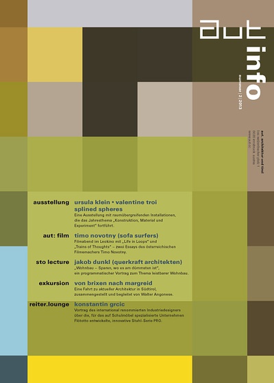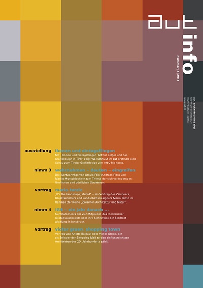 Eine umfangreiche Sonderausgabe der Programmzeitschrift aut: info mit einem Einblick in die 20-jährige Geschichte und das breite Tätigkeitsfeld des aut, Hintergrundinformationen zur Ausstellung "20 jahre architektur und tirol" und zum Programm des aut zwischen Oktober und November 2014.