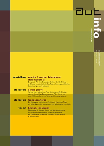 Die Ausgabe 3/15 der Programmzeitschrift aut: info mit Hintergrundinformationen zur Ausstellung "Martin und Werner Feiersinger: Italomodern 2" und zum Programm des aut zwischen Oktober 2015 und Feber 2016.