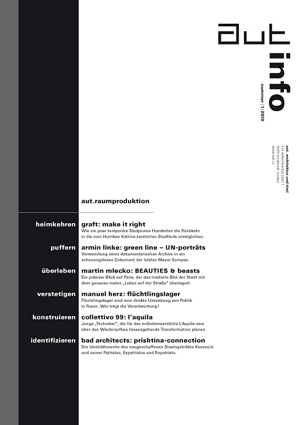 Die aut: info 1/10 stellt außerdem die ersten 6 Positionen vor, die im Rahmen der „aut.raumproduktion“ gezeigt werden: GRAFT Architekten, die ihr gemeinsam mit Brad Pitt entwickeltes Projekt „Make It Right“ vorstellen, Armin Linke, der ein Fotoarchiv der UN in ein schonungsloses Dokument über die Pufferzone „Green Line“ in Zypern verwandelt, Martin Mlecko, der in seiner Fotoarbeit „BEAUTIES & beasts“ das tradierte Bild der Stadt Paris mit der Realität des Überlebens auf der Straße überlagert, Manuel Herz, der sich mit dem Thema der Flüchtlingslager als Umsetzung von Politik in Raum auseinandersetzt, das in Folge des Erdbebens in L'Aquila gegründete Collettivo 99 und die sich mit der Identitätssuche in Kosovo/a beschäftigende bad architects group.