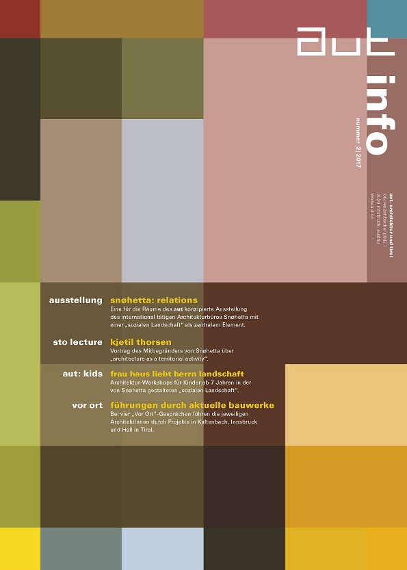 Der Schwerpunkt dieser Ausgabe der aut: info liegt auf der Sommerausstellung 2017 des international renommierten norwegischen Studios Snøhetta. Eigens für die Räume des aut konzipiert, macht die Ausstellung „Snøhetta: Relations“ den für das Studio so charakteristischen interdisziplinären, sozialen und landschaftsbezogenen Ansatz sicht- und erlebbar. Als zentrales Element wird eine „soziale Landschaft“ gebaut, auf der man liegen, sitzen und gehen kann, die zu einer neuen Art der Raumwahrnehmung animieren will oder zum Picknicken einlädt. Neben dieser 1:1-Intervention werden zahlreiche Projekte mit Entwürfen, Prototypen, Modellen und Fotos vorgestellt.