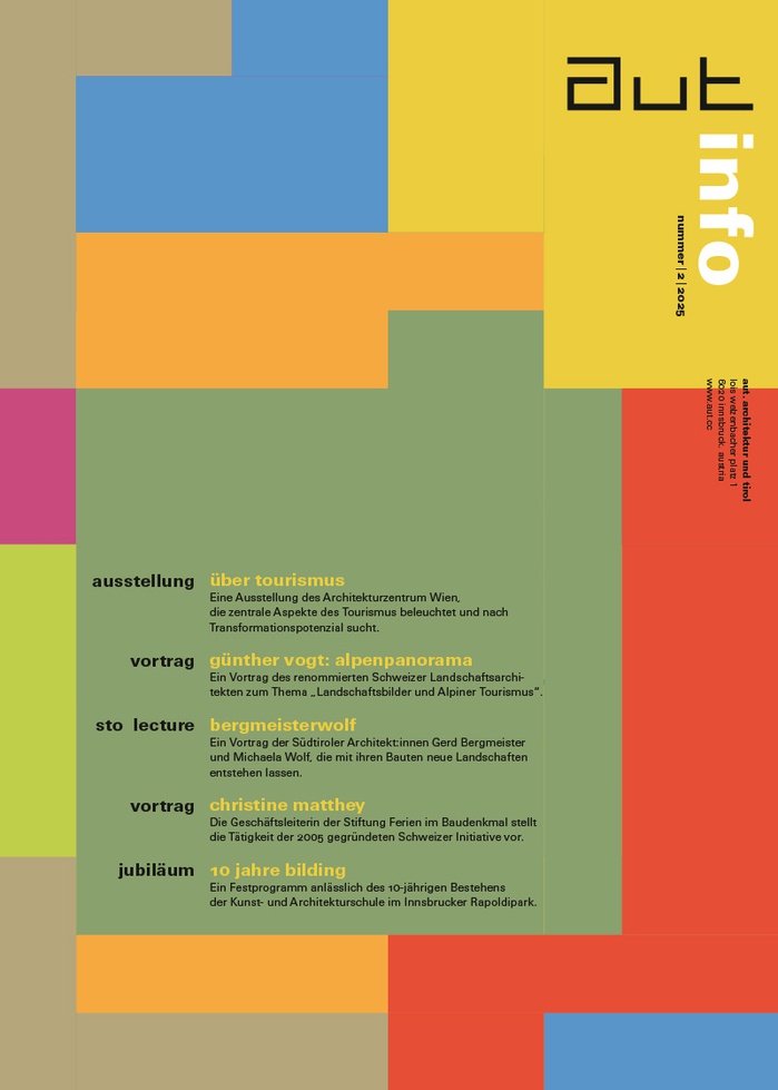 In der aut: info 2/25 finden Sie Hintergrundinformationen zu dieser Ausstellung sowie zu all unseren Veranstaltungen bis Mitte Oktober 2025, darunter Vorträge von Architekt:innen und Wissenschaftlern, die sich verschiedenen Aspekten unserer gebauten und ungebauten Kulturlandschaft widmen, ein Kurzfilmabend über Phänomene des Massentourismus sowie zwei "Vor Ort"-Gespräche bei kürzlich fertig gestellten Bauwerken in Tirol.