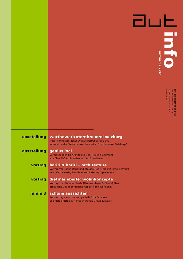 aus dem inhalt - „Wettbewerb Sternbrauerei Salzburg“ – Ausstellung sämtlicher Wettbewerbsbeiträge des internationalen Wohnbauwettbewerbs „Sternbrauerei Salzburg“. - Ausstellung „genius loci“ – Vermessungen zu Architektur und Tirol mit Beiträgen von über 100 Architekten und Architektinnen. - Programm des aut zwischen Mai und Juni 2007 u. a. mit Vorträgen von Dietmar Eberle, Gisue Hariri und Mojgan Hariri, maxRIEDER und Thomas Forsthuber - Verleihung des „Josef-Lackner-Preis 2007“ an Othmar Barth