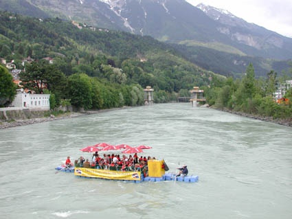 Architekturtage 2006, Tag 2: Die Stadt vom Inn - Floßfahrt – Floßfahrt von Kranebitten nach Hall – eine seltene Gelegenheit, Innsbruck vom Fluß aus wahrzunehmen.