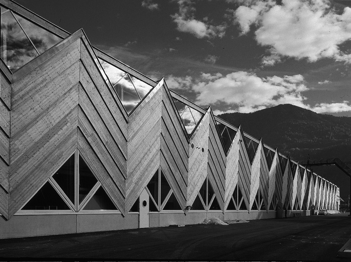 Mit dem Binder Schichtholzwerk schuf Lackner ein konstruktiv und räumlich spannendes Statement zum Thema Gewerbebau. Zwei Hallen mit jeweils 44 m Breite und über 100 m Länge sind stützenfrei von einem Faltwerk aus Hohlkastenelementen überspannt. Entlang der bootsförmigen, mit dem Kiel nach oben liegenden Elemente, bringen Lichtbänder Tageslicht in die großen Hallen. An den Außenwänden rhythmisiert die diagonale Aussteifung in einer Zickzack-Bewegung die Fassaden.