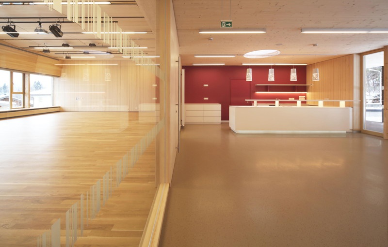 Niveaugleich an den Veranstaltungstrakt angeschlossen entstand als eigentliches Herzstück der Anlage ein Festplatz, dessen gedeckte und offene Bereiche sich bestens dafür eignen, Treffpunkt und Veranstaltungsort für die unterschiedlichsten Anlässe im Dorfleben zu sein. Das „Vor Ort“-Werkgespräch bietet die Möglichkeit, das 2012 fertig gestellte Gebäude gemeinsam mit dem Architekten zu besichtigen.