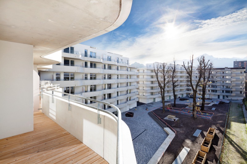 Den 2011 dazu ausgeschriebenen, EU-weiten Wettbewerb gewannen Schenker Salvi Weber Architekten mit einem Projekt, das die Jury als „verblüffend einfache Neuinterpretation einer Blockrandbebauung“ überzeugte. Ihr Konzept beruht auf der Grundidee einer klaren Trennung von Straßen- und Hofraum in eine „harte Schale“ und einen „weichen Kern“. Zur Straße hin wurden die bestehenden Fluchten weitergeführt und die Fassade betont schlicht gestaltet. In der Mitte teilt sich der Bau in zwei spiegelgleiche, zum Innenhof hin abgetreppte Körper mit einer konkaven Gebäudeflucht, die sich Richtung Kopfbauten verjüngt. Ausgehend von den Wohnungen mit ihren vielfältigen, ineinander verwobenen Grundrissen baut sich das Gebäude in Schichten auf – die letzte bildet eine wellenförmigen Balkonzone zum Innenhof.