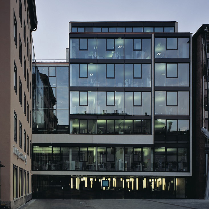 Die Konzeption des neuen Sparkassenplatzes – in Zusammenarbeit mit Rainer Schmidt – entwickelte sich aus der Idee, eine großzügige urbane Fläche freizuspielen. Die gestalterischen Eingriffe sind gering und weichen nur wenig von herkömmlichen Straßen- und Gehsteigmaterialien ab. Der Platz schafft damit Raum für Aktivitäten auf der sich neu entwickelnden innerstädtischen Querachse: Adolf-Pichler-Platz über Rathaus, Sparkassenplatz bis Bahnhof und Frachtenbahnhofbebauung.Die besondere Herausforderung bei dem Bürogebäude bestand darin, dass nur 1/3 der Hüllfläche über Belichtungsmöglichkeiten verfügt. Daraus resultiert ein komplexes inneres Raumgefüge mit der Kernidee, das Erdgeschoß bis zur Rückwand dem Platz zuzuordnen. Die Gebäudestruktur aus bauteilgekühlten und vorgespannten Decken erlaubt große Flexibilität in der Bürokonzeption.